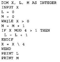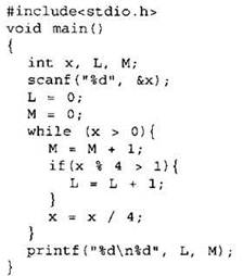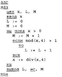 20. Ниже на четырёх языках записан алгоритм. Получив на вход число х, этот алгоритм печатает два числа L и М. Укажите наименьшее число х, при вводе которого алгоритм печатает сначала 2, а потом 4.
