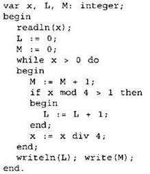 В качестве ответа вам необходимо привести фрагмент программы (или описание алгоритма на естественном языке), который должен находиться на месте многоточия. Вы можете записать решение также на другом языке программирования (укажите название и используемую версию языка программирования, например Borland Pascal 7.0) или в виде блок-схемы. В этом случае вы должны использовать те же самые исходные данные и переменные, какие были предложены в условии (например, в образце, записанном на естественном языке).