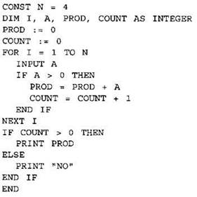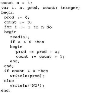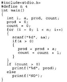 24. Требовалось написать программу, которая вводит с клавиатуры последовательность из n целых чисел (n = 4), и выводит на экран произведение положительных чисел среди этой последовательности. Если в последовательности нет положительных чисел, программа выводит “NO”. Известно, что вводимые числа не превышают по модулю 1000. Программист торопился и написал программу неправильно.