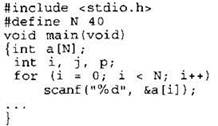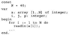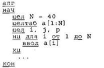 Объявляем массив А из 40 элементов. Объявляем целочисленные переменные I, J, Р. В цикле от 1 до 40 вводим элементы массива А с 1-го по 40-й. ... |