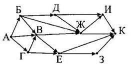 15. На рисунке — схема дорог, связывающих города А, Б, В, Г, Д, Е, Ж, 3, И, К. По каждой дороге можно двигаться только в одном направлении, указанном стрелкой. Сколько существует различных путей из города А в город К?