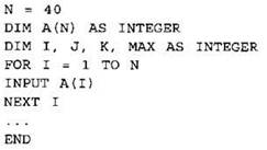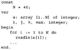 Объявляем массив А из 40 элементов. Объявляем целочисленные переменные I, J, К, МАХ. В цикле от 1 до 40 вводим элементы массива А с 1-го по 40-й. ... |
