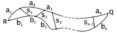 Необходимо найти кратчайшее расстояние между населёнными пунктами R и Q при условии, что можно ехать по любой дороге — А или В, и любое количество раз переезжать (если это нужно/короче) по дорогам-связкам с одной дороги на другую.