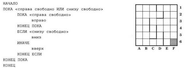 14. Система команд исполнителя РОБОТ, “живущего” в прямоугольном лабиринте на клетчатой плоскости включает 4 команды-приказа и 4 команды проверки условия. Команды-приказы: