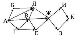 15. На рисунке — схема дорог, связывающих города А, Б, В, Г, Д, Е, Ж, 3, И, К. По каждой дороге можно двигаться только в одном направлении, указанном стрелкой. Сколько существует различных путей из города А в город К?