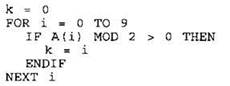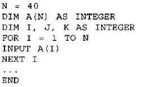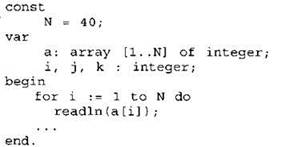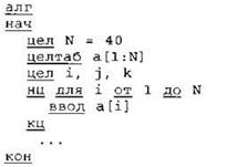 Объявляем массив А из 40 элементов. Объявляем целочисленные переменные I, J, К. В цикле от 1 до 40 вводим элементы массива А с 1-го по 40-й. ... |