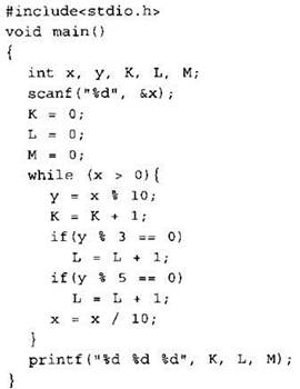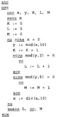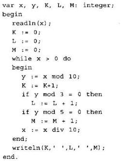20. Ниже на четырёх языках записан алгоритм. Получив на вход число х, этот алгоритм печатает три числа К, М и L. Укажите наименьшее число х, при вводе которого алгоритм печатает сначала 3, потом 2, потом ещё 2.