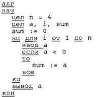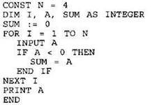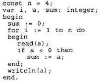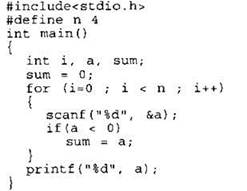24. Требовалось написать программу, которая вводит с клавиатуры последовательность из n целых чисел (n = 4), и выводит на экран сумму отрицательных чисел среди этой последовательности. Если в последовательности нет отрицательных чисел, программа должна вывести 0. Известно, что вводимые числа не превышают по модулю 1000. Программист торопился и написал программу неправильно.