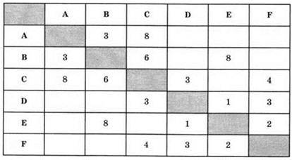 3. Между населёнными пунктами А, В, С, D, Е, F построены дороги, протяжённость которых приведена в таблице. (Отсутствие числа в таблице означает, что прямой дороги между пунктами нет.)