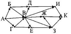 15. На рисунке — схема дорог, связывающих города А, Б, В, Г, Д, Е, Ж, 3, И, К. По каждой дороге можно двигаться только в одном направлении, указанном стрелкой. Сколько существует различных путей из города А в город К?