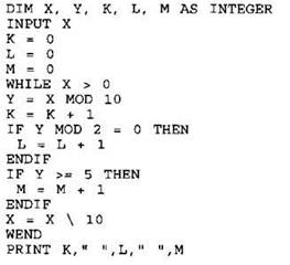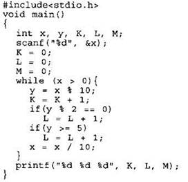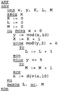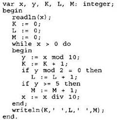 20. Ниже на четырёх языках записан алгоритм. Получив на вход число х, этот алгоритм печатает три числа К, М и L. Укажите наименьшее число х, при вводе которого алгоритм печатает сначала 3, потом 3, потом 1.