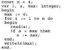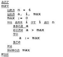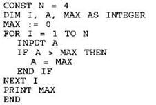 24. Требовалось написать программу, которая вводит с клавиатуры последовательность из n целых чисел (n = 4), и выводит на экран максимальное число этой последовательности. Известно, что вводимые числа не превышают по модулю 1000. Программист торопился и написал программу неправильно.