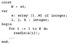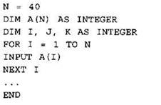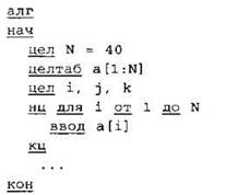 Объявляем массив А из 40 элементов. Объявляем целочисленные переменные I, J, К. В цикле от 1 до 40 вводим элементы массива А с 1-го по 40-й. ... |