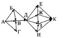 15. На рисунке — схема дорог, связывающих города А, Б, В, Г, Д, Е, Ж, 3, И, К. По каждой дороге можно двигаться только в одном направлении, указанном стрелкой. Сколько существует различных путей из города А в город К?
