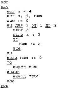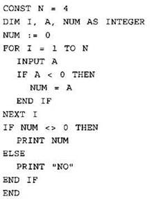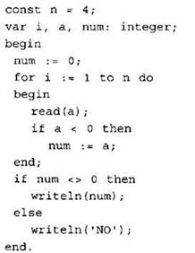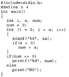 24. Требовалось написать программу, которая вводит с клавиатуры последовательность из n целых чисел (n = 4), и выводит на экран порядковый номер первого отрицательного числа этой последовательности. Если в последовательности нет отрицательных чисел, программа должна вывести на экран “NO”. Известно, что вводимые числа не превышают по модулю 1000. Программист торопился и написал программу неправильно.