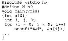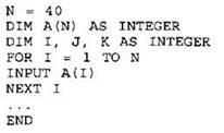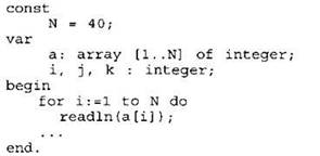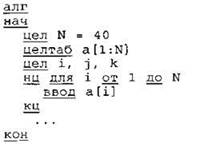 Объявляем массив А из 40 элементов. Объявляем целочисленные переменные I, J, К. В цикле от 1 до 40 вводим элементы массива А с 1-го по 40-й. ... |