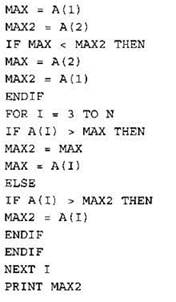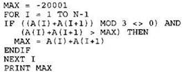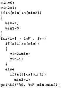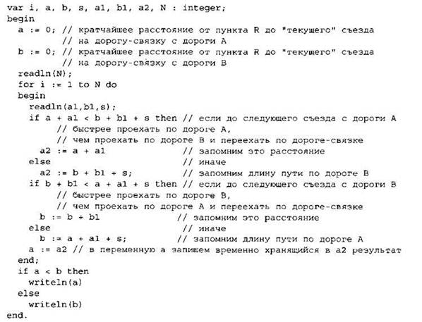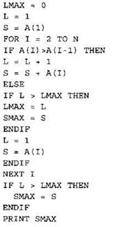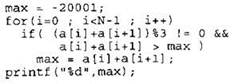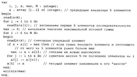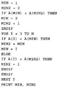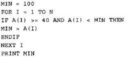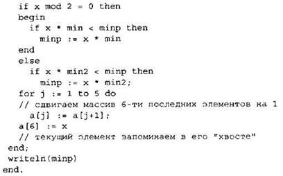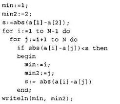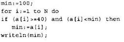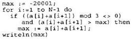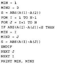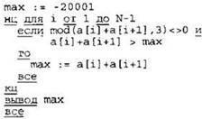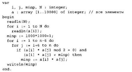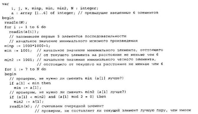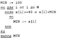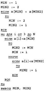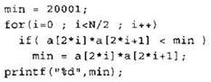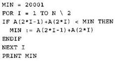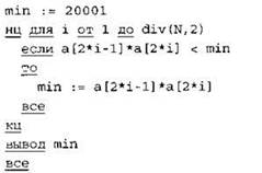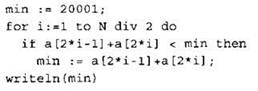 Записываем в переменную MIN начальное значение, равное 20001. В цикле перебираем номера пар элементов с 1-го до 20-го. Вычисляем номера элементов в паре как удвоенное значение номера пары и удвоенное значение номера пары минус 1. Сумму значений элементов с такими номерами сравниваем со значением переменной MIN. Если эта сумма оказывается меньше, записываем ее в переменную MIN. После окончания цикла выводим на экран значение переменной MIN. |