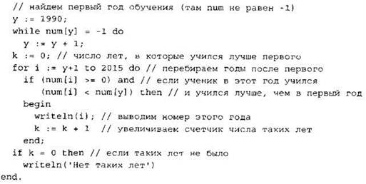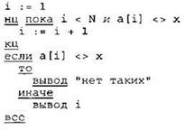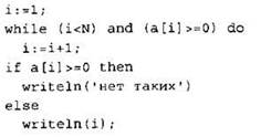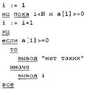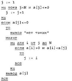 Элементы ответа: 1) -4 2) 1 2 3 4 (или любая последовательность 4-х целых чисел, в которой все элементы неотрицательны) 3) (Исправление программы на языке Паскаль) В строке “if а < 0 then” должно быть “if (а < 0) and (num = 0) then”. В строке “num := а” должно быть “num := i”. |