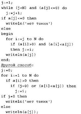 Элементы ответа: 1) 0 2) 1 2 3 4 (или любая последовательность 4-х целых чисел, в которой есть хотя бы одно положительное число) 3) (Исправление программы на языке Паскаль) В строке “if min > 0 then” должно быть “if min < 2000 then” (или min <> 2000 или min <= 1000). В строке “writeln (0)” должно быть “writeln('NO')”. |