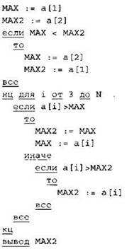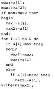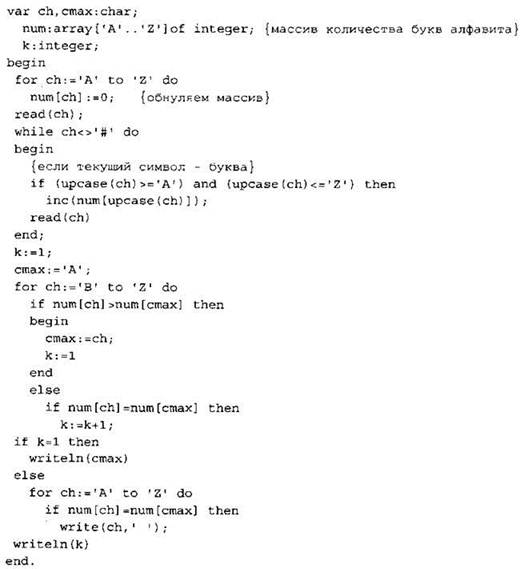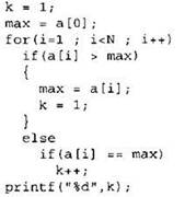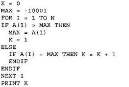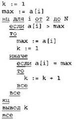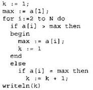 Записываем в переменную К начальное значение, равное 1. Записываем в переменную МАХ начальное значение, равное первому элементу массива. В цикле перебираем элементы со 2-го до 40-го. Если значение текущего элемента массива больше значения переменной МАХ, то в переменную МАХ кладем значение текущего элемента и кладем в переменную К число 1. Иначе, если значение текущего элемента равно значению переменной МАХ, увеличиваем значение переменной К на 1. После окончания цикла выводим на экран значение переменной К. |