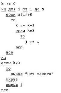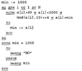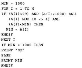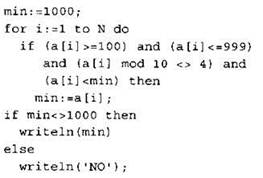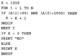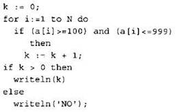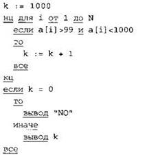 Записываем в переменную К начальное значение, равное 0. В цикле перебираем все элементы с 1-го до 40-го. Если текущий элемент массива больше 99 и меньше 1000, тогда увеличиваем значение переменной К на 1. После окончания цикла: если значение переменной К осталось равно 0, то выводим на экран “NO”, иначе выводим на экран значение переменной К. |