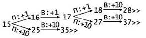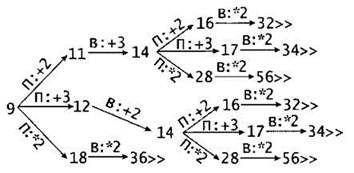 2. Верный ответ: любые 2 значения среди S = 9, S = 15, S = 16 или S = 17. Например, S = 15 или S = 16. В обоих случаях Петя должен получить в кучке 18 камней (15 + 3 = 18, 16 + 2 = 18). При любом ответном ходе Вани (18 + 2 = 20, 18 + 3 = 21 или 18 х 2 = 36), Петя должен удвоить число камней в куче и выиграть (20 х 2 = 40, 21 х 2 = 42 или 36 х 2 = 72).