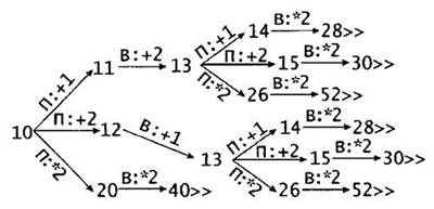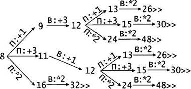 3. S = 8 (также верный ответ S = 10). Если Петя добавит в кучу 1 или 3 камня (8 + 1 = 9 или 8 + 3 = 11), Ваня должен получить в куче 12 камней (9 + 3 = 12, 11 + 1 = 12) и в ответ на любой ход Пети (12 + 1 = 13, 12 + 3 = 15 или 12 x 2 = 24), Ваня должен удвоить число камней в куче и выиграть (13 x 2 = 26, 15 х 2 = 30 или 24 х 2 = 48). Если Петя удвоит число камней в куче (8 x2 = 16), Ваня также должен удвоить число камней в куче и выиграть (16 x 2 = 32).