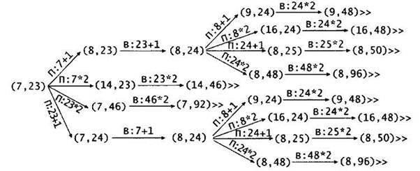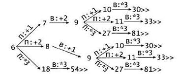 (Здесь рисовать дерево ВСЕХ ходов Пети и ответных ходов Вани. На каждом ребре писать наподобие "П:5+1" (это значит, что Петя добавляет 1 камень в кучку, в которой 5 камней)).