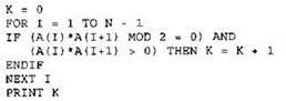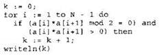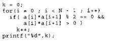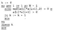 Записываем в переменную К начальное значение, равное нулю. В цикле перебираем все элементы с 1-го до 39-го. Если текущий элемент массива умножить на следующий элемент массива дает остаток от деления на 2 равный нулю И это произведение больше нуля, тогда увеличиваем на единицу значение переменной К. После окончания цикла выводим на экран значение переменной К. |