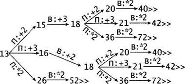 3. S = 13 (также верный ответ S = 14). Если Петя добавит в кучу 2 или 3 камня (13 + 2 = 15 или 13 + 3 = 16), Ваня должен получить в куче 18 камней (15 + 3 = 18, 16 + 2 = 18) и в ответ на любой ход Пети (18 + 2 = 20, 18 + 3 = 21 или 18 х 2 = 36), Ваня должен удвоить число камней в куче и выиграть (20 х 2 = 40, 21 х 2 = 42 или 36 х 2 = 72). Если Петя удвоит число камней в куче (13 х 2 = 26), Ваня также должен удвоить число камней в куче и выиграть (26 х 2 = 52).