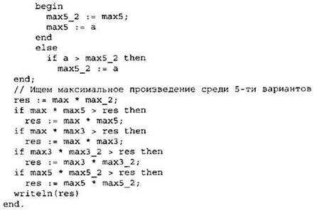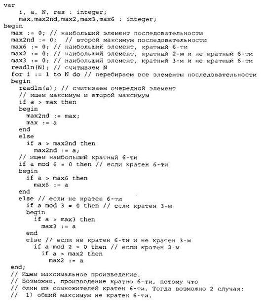 Элементы ответа: 1) 6 2) 2 -1 2 -3 (или любая последовательность 4-х целых чисел, в которой два числа 2, а остальные 2 числа — неположительные) 3) (Исправление программы на языке Паскаль) В строке “prod := 0;” должно быть “prod := 1;”. В строке “prod := prod + а;” должно быть “prod := prod * а;”. |