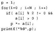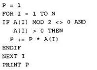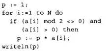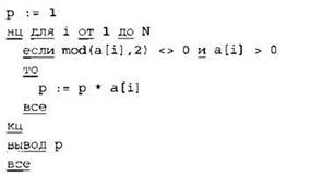 Записываем в переменную Р начальное значение, равное 1. В цикле перебираем все элементы с 1-го до 40-го. Если значение текущего элемента массива положительно и остаток от деления его на 2 не равен нулю, умножаем текущее значение переменной Р на текущий элемент массива и кладем результат в переменную Р. После окончания цикла выводим на экран значение переменной Р. |