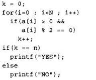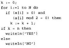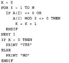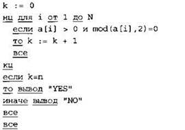 Записываем в переменную К начальное значение, равное нулю. В цикле перебираем все элементы с 1-го до 40-го. Если значение текущего элемента массива больше нуля, и при этом его остаток от деления на 2 равен нулю, увеличиваем значение переменной К на 1. После окончания цикла: если значение переменной К равно 40, выводим на экран “YES”, иначе выводи на экран “NO”. |