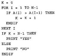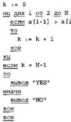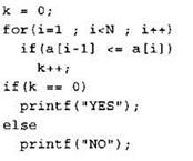 Записываем в переменную К начальное значение, равное нулю. В цикле перебираем элементы со 2-го до 40-го. Если значение текущего элемента массива меньше или равно значению предыдущего элемента массива, увеличиваем значение переменной К на 1. После окончания цикла: если значение переменной К равно нулю, выводим на экран “YES”, иначе выводи на экран “NO”. |