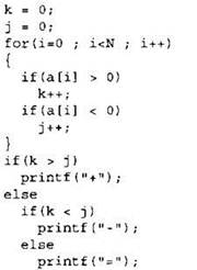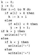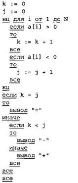 Записываем в переменные К и J начальные значения, равные нулю. В цикле перебираем все элементы с 1-го до 40-го. Если значение текущего элемента массива больше нуля, увеличиваем значение переменной К на 1. Если значение текущего элемента массива меньше нуля, увеличиваем значение переменной J на 1. После окончания цикла: если значение переменной К равно значению переменной J, выводим на экран “=”, иначе если значение переменной К больше значения переменной J, выводим на экран “+”, иначе выводим на экран “-”. |