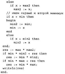 Элементы ответа: 1) 0 2) 0 0 0 0 (или любая последовательность 4-х целых чисел, в которой есть хотя бы один ноль, а другие числа отрицательные) 3) (Исправление программы на языке Паскаль) В строке “max := 0 ; ” должно быть “max := -1001” (или любое число <=1000). В строке “а := max” должно быть “max := а”. |