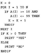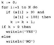 Записываем в переменную К начальное значение, равное нулю. В цикле перебираем все элементы с 1-го до 40-го. Если значение текущего элемента массива больше девяти и меньше ста, увеличиваем значение переменной К на 1. После окончания цикла: если значение переменной К больше нуля, выводим на экран “ YES”, иначе выводим на экран “N0”. |