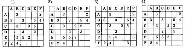 3. В таблице приведена стоимость перевозок между соседними железнодорожными станциями. Перечислите в порядке возрастания, без пробелов и запятых, номера таблиц, соответствующих схеме.