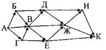 15. На рисунке — схема дорог, связывающих города А, Б, В, Г, Д, Е, Ж, И, К. По каждой дороге можно двигаться только в одном направлении, указанном стрелкой. Сколько существует различных путей из города А в город К?