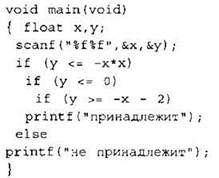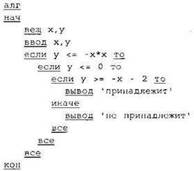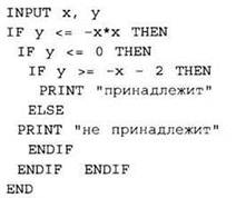24. Требовалось написать программу, которая вводит с клавиатуры координаты точки на плоскости (х, у — действительные числа) и определяет принадлежность точки заштрихованной области. Программист торопился и написал программу неправильно.