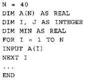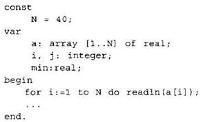 Объявляем массив А из 40 элементов. Объявляем целочисленные переменные I, J, и вещественную переменную MIN. В цикле от 1 до 40 вводим элементы массива А с 1-го по 40-й. ... |