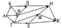 15. На рисунке — схема дорог, связывающих города А, Б, В, Г, Д, Е, Ж, И, К. По каждой дороге можно двигаться только в одном направлении, указанном стрелкой. Сколько существует различных путей из города А в город К?