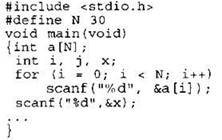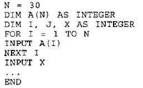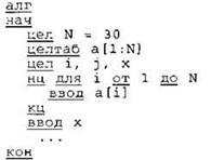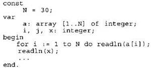 Объявляем массив А из 30 элементов. Объявляем целочисленные переменные I, J. В цикле от 1 до 30 вводим элементы массива А с 1-го по 30-й. Вводит переменную X. ... |