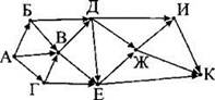 15. На рисунке — схема дорог, связывающих города А, Б, В, Г, Д, Е, Ж, И, К. По каждой дороге можно двигаться только в одном направлении, указанном стрелкой. Сколько существует различных путей из города А в город К?