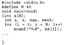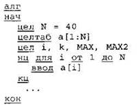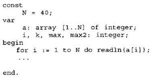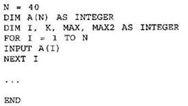 Объявляем массив А из 40 элементов. Объявляем целочисленные переменные I, К, MAX, МАХ2. В цикле от 1 до 40 вводим элементы массива А с 1-го по 40-й. ... |