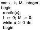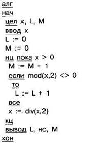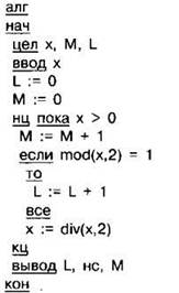 Задание 4.11.8. Ниже на 4 языках записан алгоритм. Получив на вход число х, этот алгоритм печатает два числа: L и М. Укажите наименьшее из таких чисел х, при вводе которых алгоритм печатает сначала 0, а потом 24.