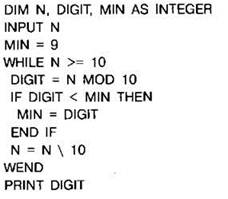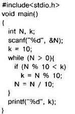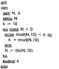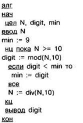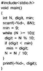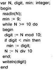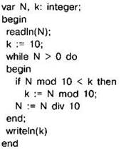 Задание 4.16.1. Программа должна определять наименьшую цифру в заданном натуральном числе. С клавиатуры считывается натуральное число N, не превосходящее 109, и выводится минимальная цифра этого числа. Программист торопился и написал программу неправильно.