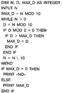 Задание 4.16.9. Требовалось написать программу, которая вводит с клавиатуры натуральное число N (N<109) и выводит на экран наибольшую чётную цифру числа. Если в числе нет чётных цифр, программа должна вывести “NO”. Программист торопился и написал программу неправильно.