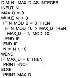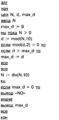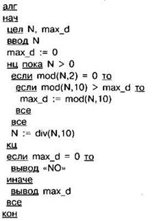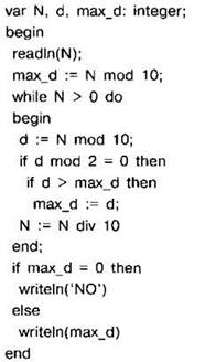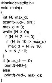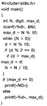 Задание 4.16.3. С клавиатуры считывается натуральное число N, не превосходящее 109. Программа должна выводить максимальную чётную цифру этого числа. Если таких цифр нет, нужно вывести на экран “NO”. Программист торопился и написал программу неправильно.