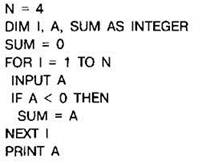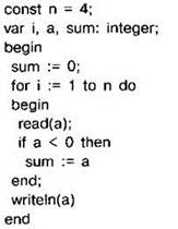 Задание 4.16.5. Требовалось написать программу, которая вводит с клавиатуры последовательность из n целых чисел (n=4), и выводит на экран сумму отрицательных чисел среди этой последовательности. Если в последовательности нет отрицательных чисел, программа должна вывести 0. Известно, что вводимые числа не превышают по модулю 1000. Программист торопился и написал программу неправильно.